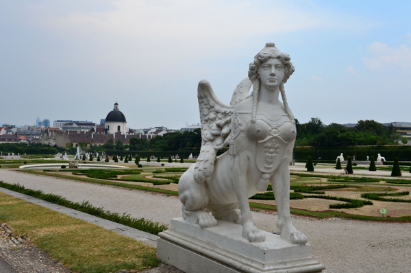 벨베데레 궁의 정원은 자연 상태로 무성하게 자라게 하는 영국식 정원과 달리 프랑스 베르사유궁의 정원을 모방하여 방사선 혹은 원형 등 다양한 모양으로 배치하고 수목을 심었다. 빈의 쉔브룬 궁, 호프부르크 궁, 벨베데레 궁의 설계와 정원 등을 통해서 우리는 합스부르크가가 프랑스의 부르봉 왕조의 문화와 예술을 얼마나 부러워했는지 잘 알 수 있다. 벨베데레 궁 입구에는 지혜를 상징하는 스핑크스(Sphinx) 조각들이 곳곳에 세워져 있는데, 그리스신화에서 스핑크스는 얼굴은 아름다운 여인이지만, 몸통은 사자이고 독수리 날개가 달린 것으로 묘사되는 괴물로서 ‘지혜가 샘 솟는 원천’이라는 의미가 있다. 완만한 경사를 이루며 아래로 길게 펼쳐진 벨베데레 궁의 뒤로는 빈의 시가지가 한눈에 보이고, 성 슈테판 성당의 첨탑도 보인다.