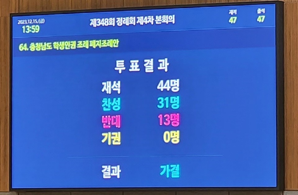 ㄴ '충남도 학생인권조례 폐지 조례안' 주민 발의
