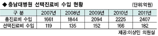 충남대병원의 경우 총진료비는 2008년 1661억 원에서 2011년 2407억 원으로 44.9%, 선택진료비는 119억 원에서 182억 원으로 52.9%나 급증해 전국 평균 증가율을 크게 상회했다.