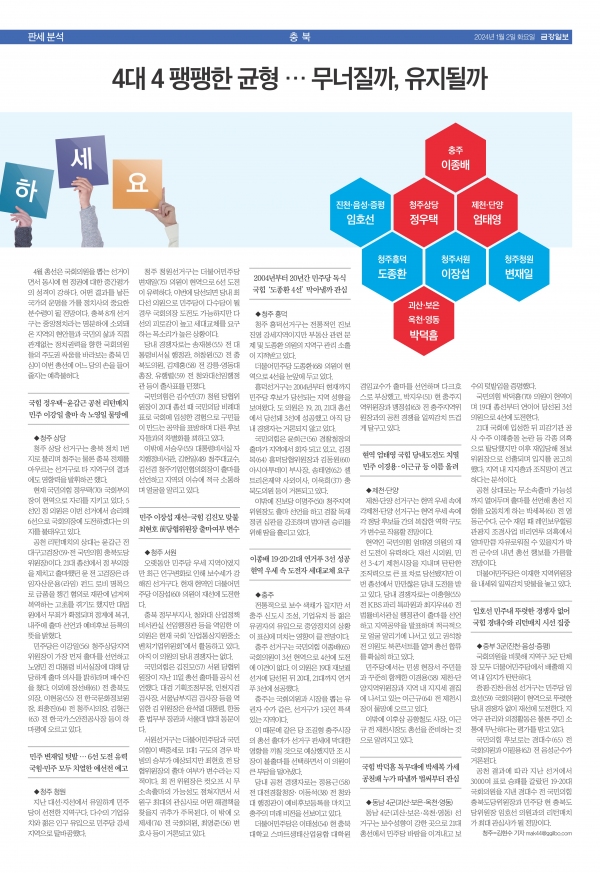 4월 총선은 국회의원을 뽑는 선거이면서 동시에 현 정권에 대한 중간평가의 성격이 강하다. 어떤 결과를 낳든 국가의 운명을 가를 정치사의 중요한 분수령이 될 전망이다. 충북 8개 선거구는 중앙정치라는 명분하에 소외돼온 지역의 현안들과 국민의 삶과 직접 관계없는 정치권력을 향한 국회의원들의 주도권 싸움을 바라보는 충북 민심이 이번 총선에 어느 당의 손을 들어줄지는 예측불허다.