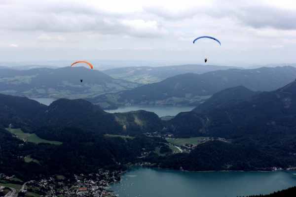 산 중턱에 있는 케이블카 종점에서 내리니, 하산하기 위하여 기다리는 사람이며 선탠을 즐기려는 사람들이 많았다. 이곳에서 산 정상까지는 그리 높지 않았지만, 산 정상에서 조망을 즐기는 사람들, 패러글라이딩하는 사람들로 마치 붐비는 시장 같았다. 멀리 가파른 경사지는 겨울철에는 스키장으로 이용되는 곳이니, 산꼭대기까지 온통 관광과 스포츠장이 되는 셈이다. 이곳에서 패러글라이딩을 즐겼고, 정상에서 바라본 길겐 마을과 볼프강호수는 마치 동화 속의 마을처럼 보였다. 소금을 채굴함으로써 배부른 자의 여유와 생활한 경험이 주민들에게 이런 환경을 만들게 했는지, 아니면 이렇게 높은 산까지 케이블카를 설치하고 패러글라이딩과 겨울철에는 스키를 탈 수 있는 시설을 만들어 세계 각국에서 사계절 관광객이 찾아오는 관광지로 만든 것인지 알 수 없지만, 주어진 자연환경을 개발하는 주민들의 노력이 부러웠다. 정상에서 두 시간쯤 머물면서 마을과 호수를 촬영하고, 패러글라이딩을 구경하다가 다시 케이블카를 타고 내려왔다.