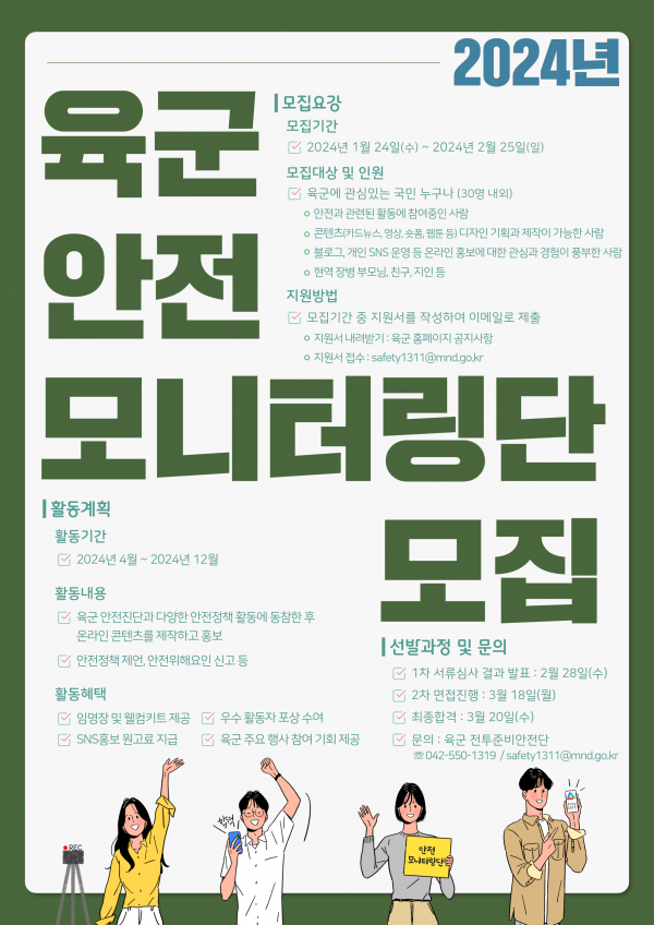 육군 전투준비안전단이 내달 25일까지 안전모니터링단을 모집한다. 안전모니터링단은 육군 안전에 관심 있는 국민이라면 누구나 지원할 수 있다. 특히 안전과 관련된 활동에 참여 중인 국민, 안전 관련 학과에 재학 중인 대학생, 현역 장병 또는 입대 예정 자녀를 둔 부모, 유튜브·인스타그램·블로그 등 SNS를 통해 다수의 국민과 활발히 소통하는 인플루언서, 영상·웹툰·카드뉴스 등 콘텐츠 제작 능력을 보유한 지원자에게는 선발시 가산점이 부여된다.
