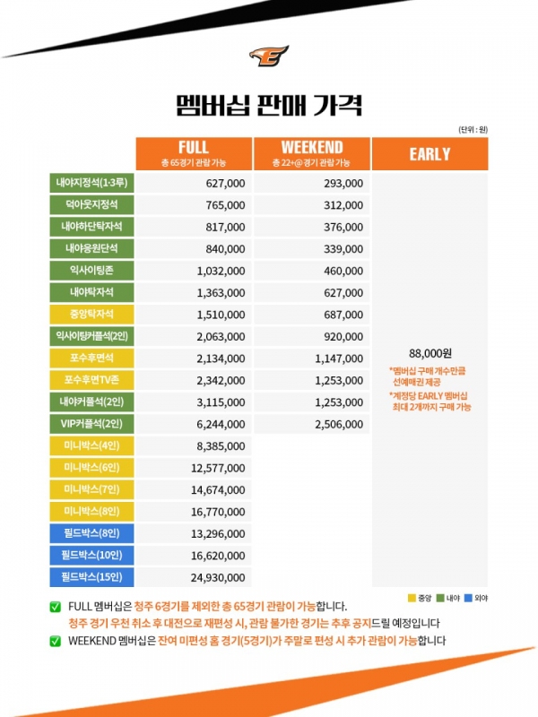 풀, 위켄드 멤버십 회원에게는 전용게이트를 통한 주말 경기 30분 선입장 혜택이 주어진다. 시구, 시타 등 멤버십데이 이벤트 참여도 가능하다. 선착순 600명을 모집하는 신설 얼리 멤버십의 회원은 기존 예매일보다 하루 빠르게 예매할 수 있는 자격을 얻는다. 얼리 멤버십의 가격은 8만 8000원으로 계정 당 2개까지 구매할 수 있으며 구매 개수만큼 혜택을 받을 수 있다.