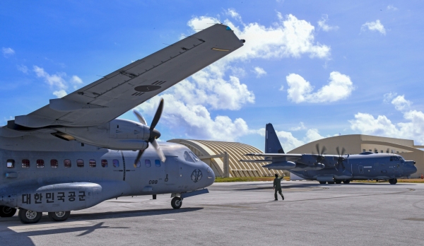 공군이 16일까지 미국 괌 앤더슨 공군기지에서 진행되는 다국적 공군훈련인 2024년 코프 노스(Cope North) 훈련에 참가한 가운데 제15특수임무비행단 소속 CN-235(왼쪽)와 미 공군 C-130J가 15일 훈련을 위해 이륙을 준비하고 있다.
