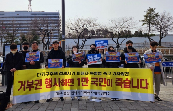 대전·경산 다가구전세사기피해자들은 “대전과 경산에 있는 다가구주택은 전국 다가구주택의 40%도 채 되지 않는 규모다. 아직 60% 이상의 다가구주택은 범죄에 노출된 채 여전히 방치되고 있다”라며 규탄했다.