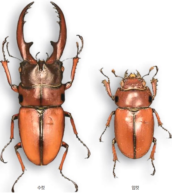 애완·학습용으로 널리 보급된 검은색 넓적사슴벌레, 왕사슴벌레 등과 모양은 비슷하나 색깔이 황갈색으로 확연하게 차이가 나고 몸체 가슴 양쪽에 2개의 점이 있는 것이 특징이다.