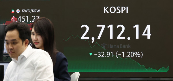 이날 코스피 종가는 전 거래일보다 32.91포인트(1.20%) 내린 2,712.14로 집계됐다.