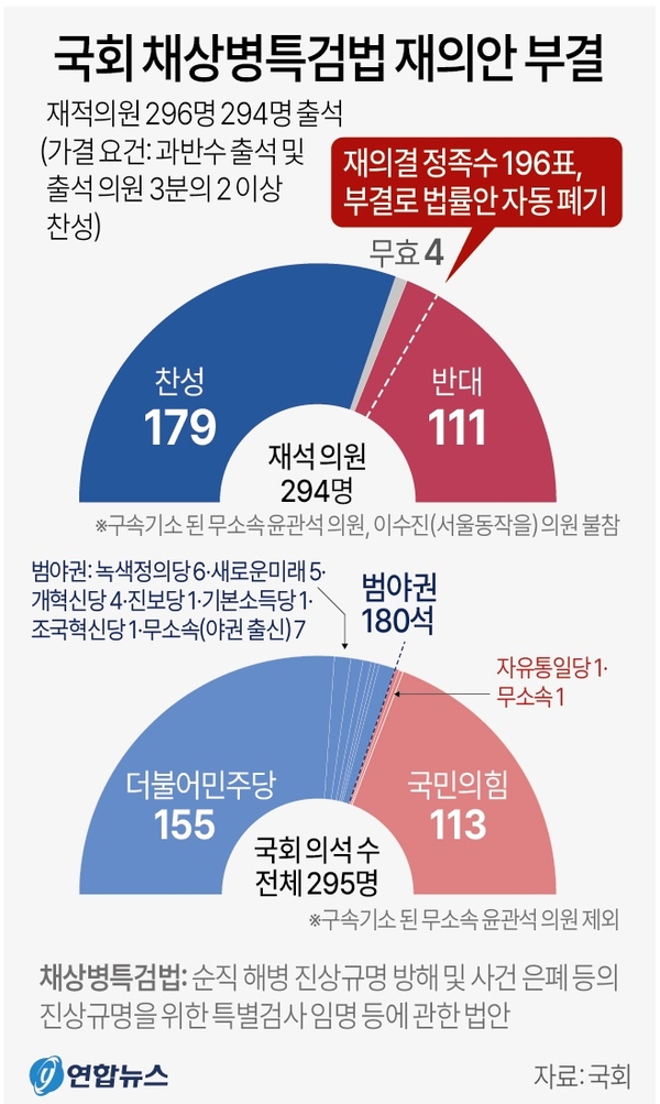 채상병 특검법은 이날 본회의에서 재석 의원 294명 중 찬성 179명, 반대 111명, 무효 4명으로 부결됐다. 앞서 채상병 특검법은 민주당 주도로 지난 2일 본회의를 통과했다. 그러나 윤 대통령은 지난 21일 취임 후 6번째(법안 10건) 거부권을 행사했다. 헌법 53조에 따르면 대통령이 재의를 요구한 법안이 다시 통과되기 위해선 재적의원 과반수 출석에 출석의원 3분의 2 이상 찬성이 필요하다. 특히 국민의힘 김웅·안철수·유의동·최재형·김근태 의원이 공개적으로 찬성 입장을 밝힌 가운데 국민의힘 내 추가 이탈표가 얼마나 나오느냐가 최대 관심사였다.