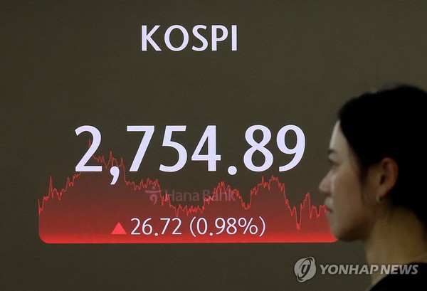 이날 코스피 종가는 전 거래일보다 26.72포인트(0.98%) 오른 2,754.89로 집계됐다. 지수는 3거래일 연속 상승세를 보였다.
