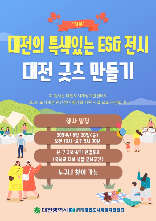 대전도시재생지원센터가 28일 대전역-중앙로 지하상가 연결통로(목척교 지하 복합문화공간)에서 ESG 전시회와 대전 굿즈 만들기 체험행사를 개최한다. 행사를 통해 현장 체험과 동시에 굿즈를 구매할 수 있다. 다양한 선물 이벤트도 준비돼 있다.