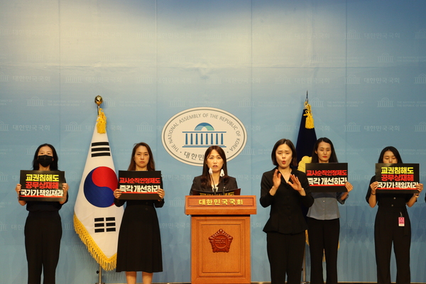 <속보>=지난달 25일 학부모의 악성민원에 시달리던 고(故) 대전용산초등학교 교사는 순직을 인정받았으나 일부 교사들의 순직 인정이 되지 않으면서 교원 순직제도의 개선을 촉구하는 목소리가 높아지고 있다. 2일 국회에서 더불어민주당 백승아 의원(비례대표)과 이윤경 대전교사노조 위원장, 정수경 초등교사노조 위원장은 기자회견을 열고 순직 제도 개선 촉구 기자회견을 개최했다. <본보 7월 1일자 6면 등 보도>