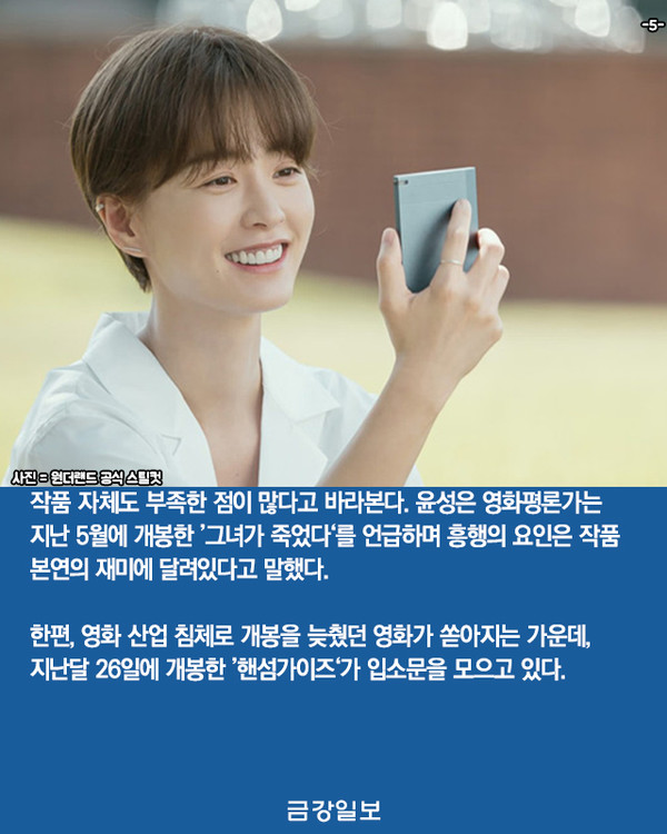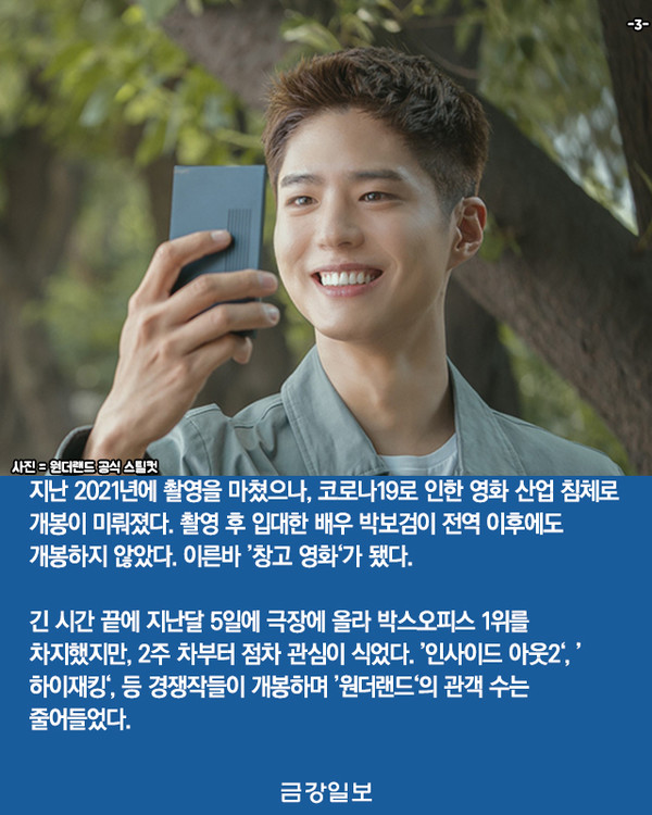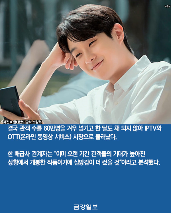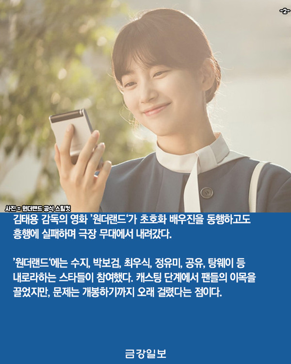 저작권자 © 금강일보 무단전재 및 재배포 금지 키워드 Tags #금강읿보 #카드뉴스 #영화 #영화관 #OTT #원더랜드 #김태용감독 #수지 #박보검 #퇴우식 #정유미 #공유 #탕웨이 #흥행 #흥행실패 이광모 대학생 기자 zkxmfk1042@naver.com 다른기사 보기 SNS 기사보내기 이메일(으)로 기사보내기 다른 공유 찾기 기사스크랩하기 댓글삭제 삭제한 댓글은 다시 복구할 수 없습니다. 그래도 삭제하시겠습니까? 비밀번호 닫기 기사 댓글 0 댓글 접기 댓글입력 권한이 없습니다. 댓글 내용입력 비회원 로그인 이름 비밀번호 댓글 내용입력 댓글쓰기 계정을 선택하시면 로그인·계정인증을 통해 댓글을 남기실 수 있습니다. 회원 로그인 비회원 글쓰기 이름 비밀번호 자동등록방지 로그인 옵션 창닫기 추천기사 [오늘의 금값시세] 11월 26일 금시세(순금·24k)는? 노타 주가, 급등... 호재는? [오늘의 운세] 26일 수요일 나의 운세는?