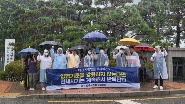 대전전세사기피해자대책위원회는 대전 최대 규모의 전세사기를 벌인 부동산 법인회사 대표 A(50) 씨에 대한 공판을 앞둔 8일 대전지방법원 앞에서 기자회견을 열고 “양형기준의 원칙에는 분명하게 양형의 차이를 둬서는 안 된다고 표기돼 있음에도 같은 수법으로 유사한 피해 규모를 발생시킨 사기범죄자에 대한 형량에는 차이가 있다”라고 주장했다.