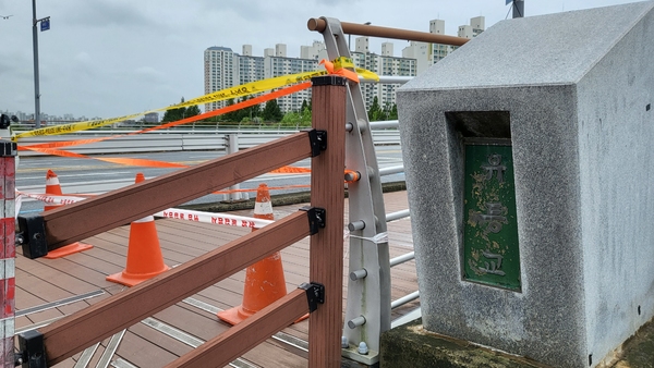 기록적인 폭우가 쏟아진 10일 대전 중구 유등교가 침하되면서 차량이 전면 통제되고 있다. 대전시는 이날 오전 8시 44분을 기점으로 차량 통행을 막았다.