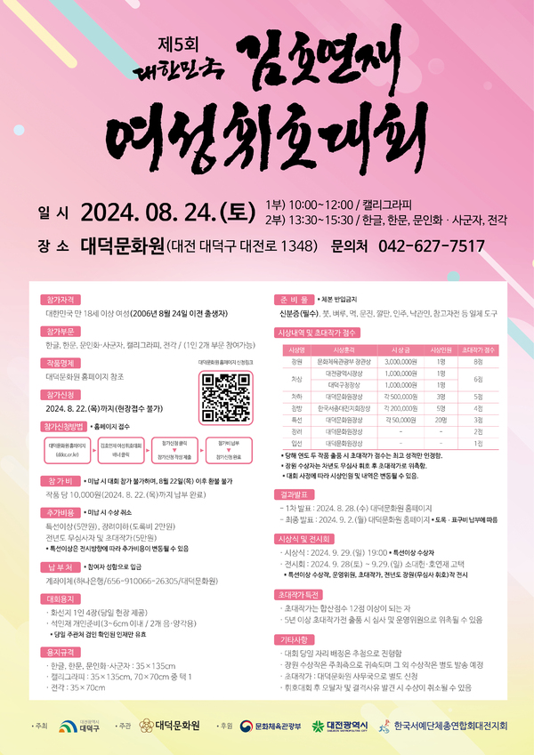 출품부문은 한글, 한문, 문인화·사군자, 전각, 캘리그라피이며 1인당 2개까지 가능하다. 대회에는 만 18세 이상 여성(2006년 8월 24일 이전 출생자) 누구나 참여할 수 있다. 참가 신청은 내달 22일까지 문화원 홈페이지(ddcc.or.kr)에서 신청서를 내려받아 작성한 후 제출하면 되며 참가비는 제출 작품 1점당 1만 원이다. 자세한 사항은 전화(042-627-7517)로 문의하면 된다.
