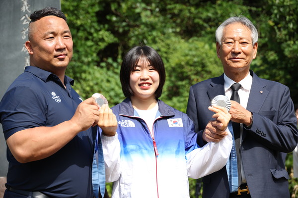 파리 올림픽에서 유도 여자 메달리스트가 된 허미미가 독립운동가인 현조부 허석 지사의 기적비를 방문했다.