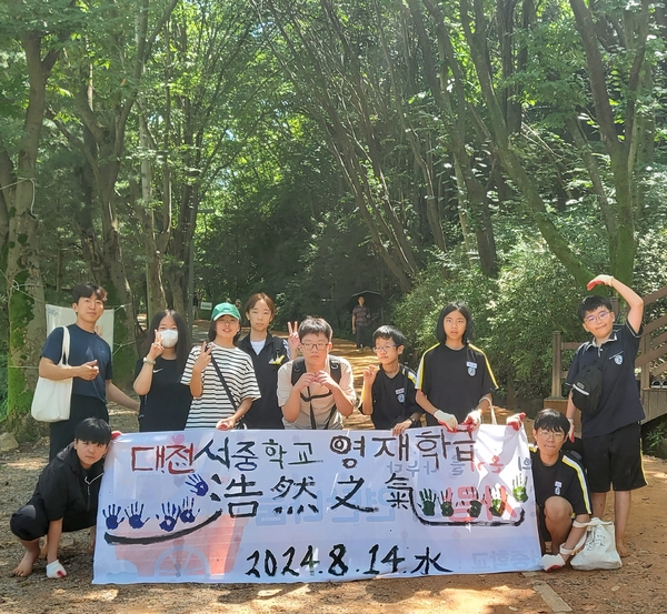 첫째 날은 법무부에서 운영하는 대전솔로몬로파크를 견학하며 모의재판을 진행하는 등 민주시민 교육을 진행하였다. 둘째 날은 ‘호연지기(浩然之氣)’의 의미를 고전 『맹자』의 원문을 통해 학습하고 서예 기초를 간단하게 익혔다. 이어서 필자와 학생들이 함께 호연지기를 활용한 현수막을 제작하였다. 필자가 한자로 호연지기(浩然之氣)를 크게 쓰고 학생들은 ‘대전서중학교 영재학급’ 10글자를 하나씩 맡아 쓰고 각자의 손도장으로 마무리하였다. 학생들에게 붓을 쥐는 법부터 또박또박 쓰기의 기초, 붓 세척하는 방법, 아크릴 물감을 손에 발라주기, 깨끗하게 손 씻고 오게 하기, 개수대 정리하기 등을 세세히 지도하였다.