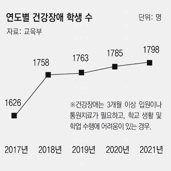 건강장애학생 수는 2017년 1626명에서 2021년 1798명으로 172명 증가했으며, 교육부 특수교육보고서에 따르면 지난해 1956명으로 매년 꾸준히 증가하고 있다.