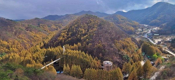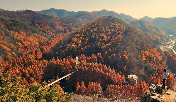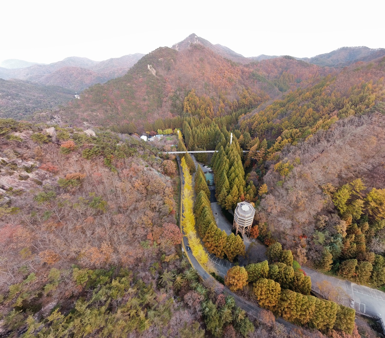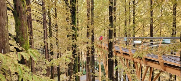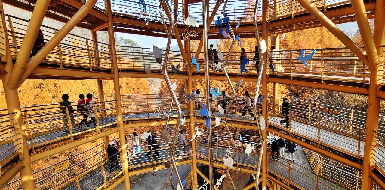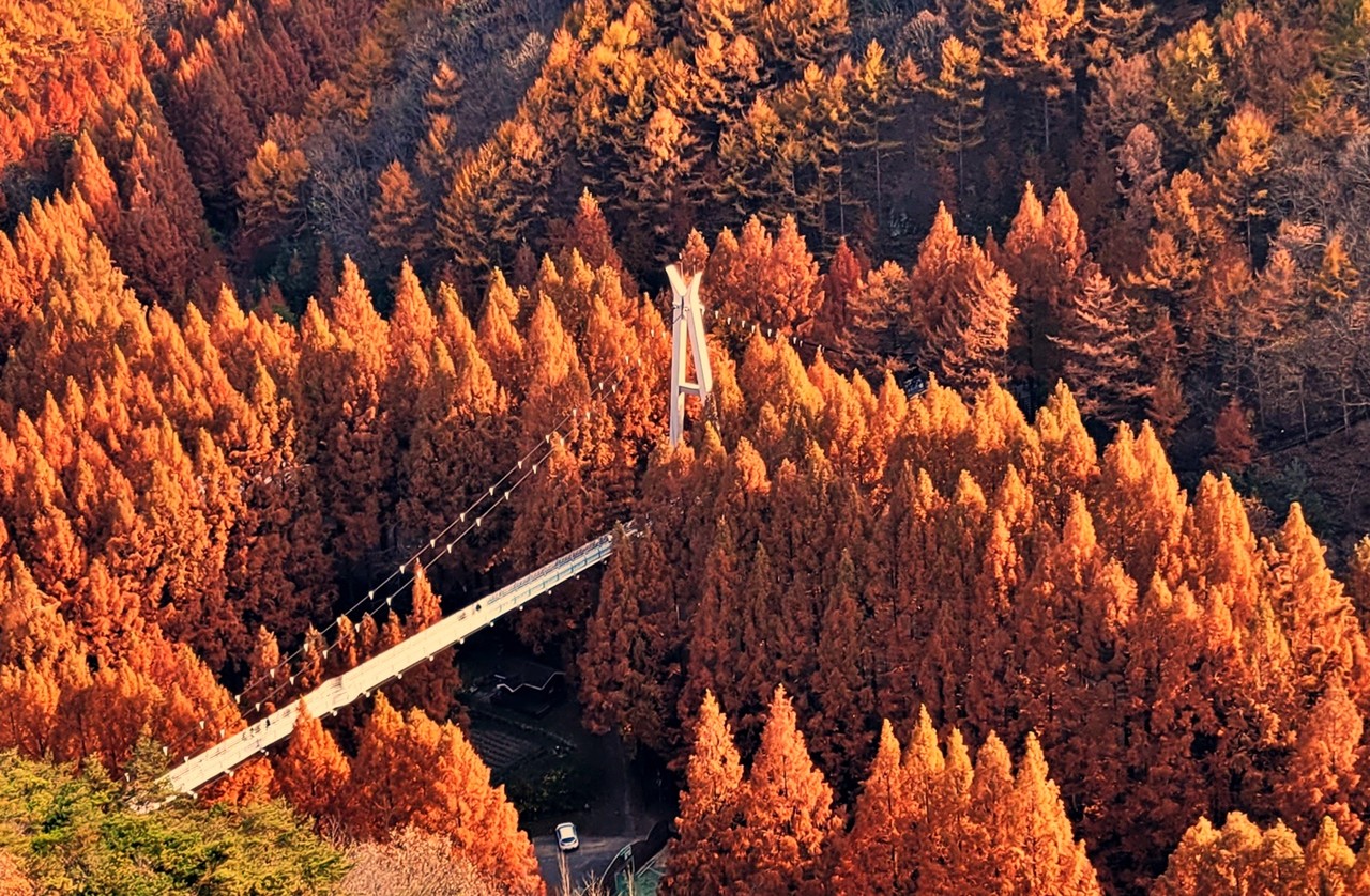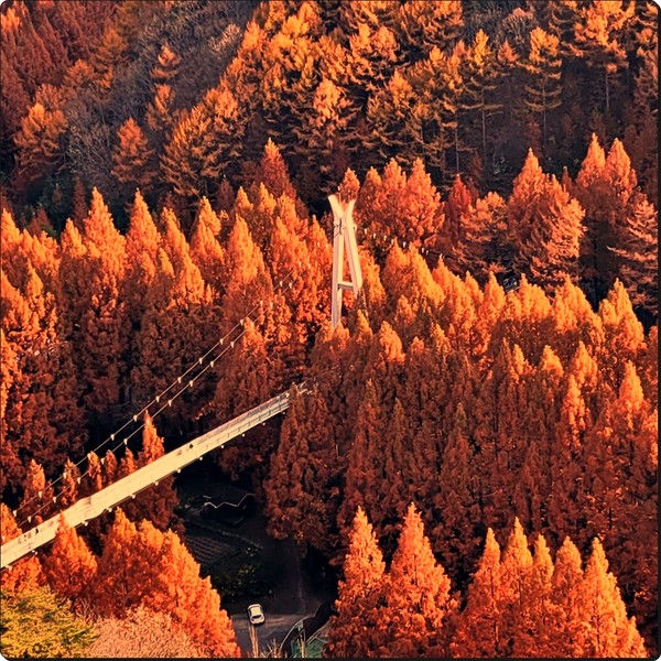 출렁다리를 건너며 숲속 어드벤처(스카이웨이, 스카이타워)로 간다. 메타세쿼이아 사이를 걷는다. 공중을 걷는다. 여기도 모든 곳이 포토존이다. 스카이타워에 먼저 올라간 일행이 손짓을 하며 외친다. "자, 여기 보세요." 까르르~ 일행 아주머니들의 웃음소리가 숲에 가득 찬다. 스카이타워 위에서 아래를 찍는 사진포인트도 아름답다.