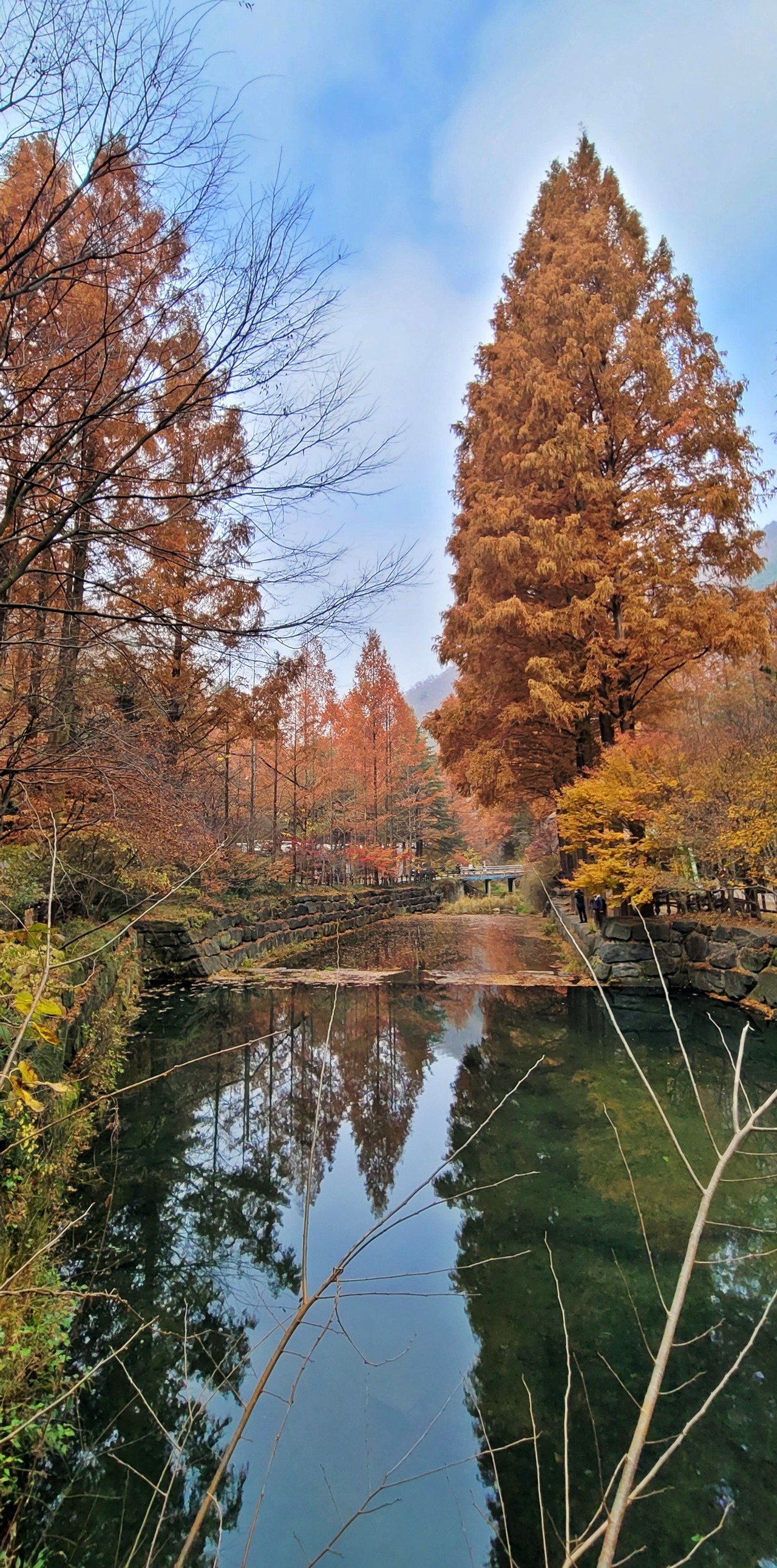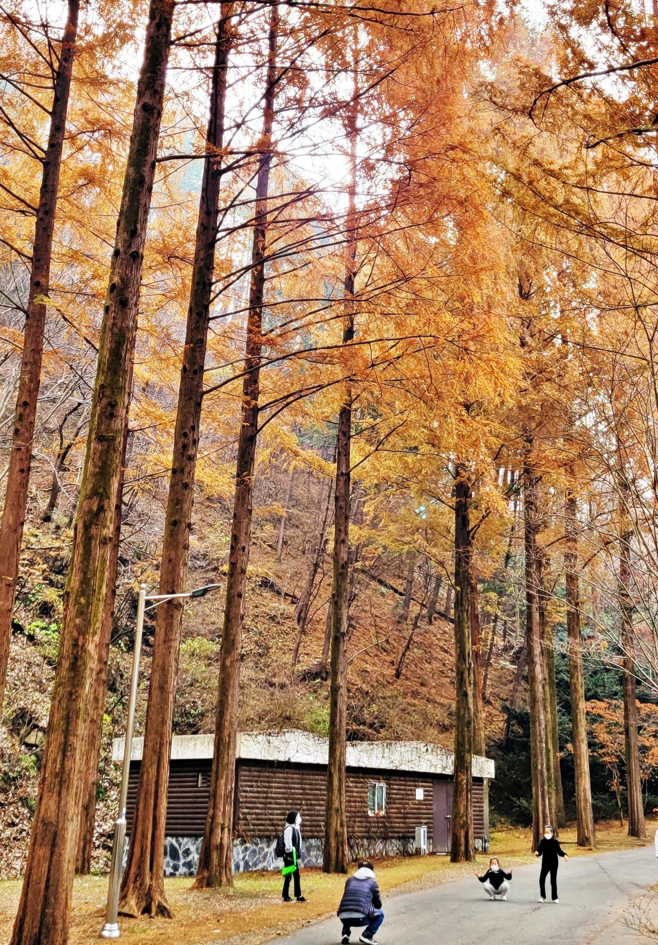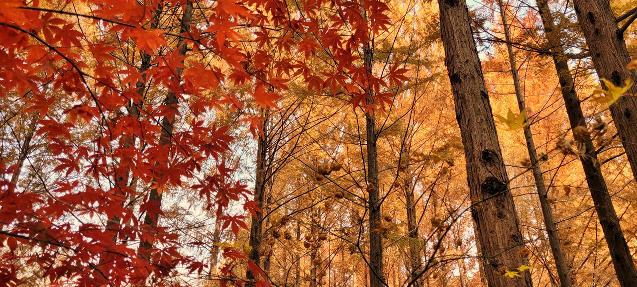 은행나무는 노란 옷을 입었고, 다른 나무들은 붉은 치장을 했는데 하이라이트 메타세쿼이아 숲은 아직 초록바람. 아주 적은 부분만 살짝 발갛게 바뀌었을 뿐 '아직'이었다.