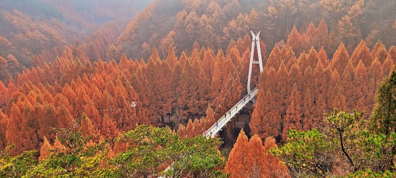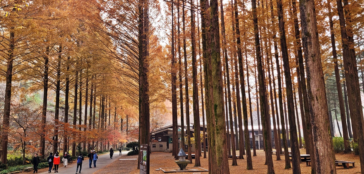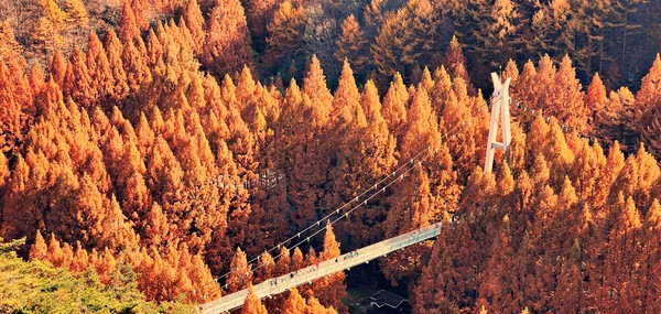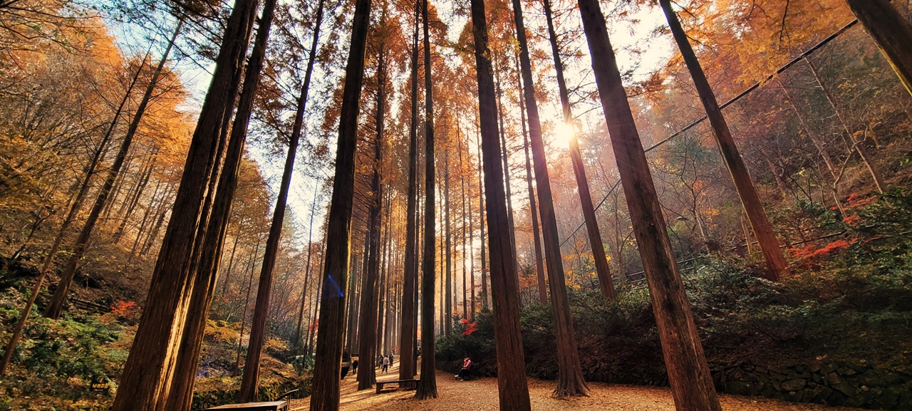 늦가을이 되면 장태산자연휴양림의 시간은 멈춘다. 화려한 빛을 내뿜으며 환상적인 공간으로 바뀐다. 메타세쿼이아 숲의 변신은 그림액자 속 상상의 시공간으로 초대한다. 신록천하 시원한 여름도 좋고, 눈 덮인 겨울의 장태산도 좋지만 붉은 계절 만추의 장태산이 역시 압권이다. 그대는 장태산휴양림의 어느 포인트를 가장 사랑하시는가.