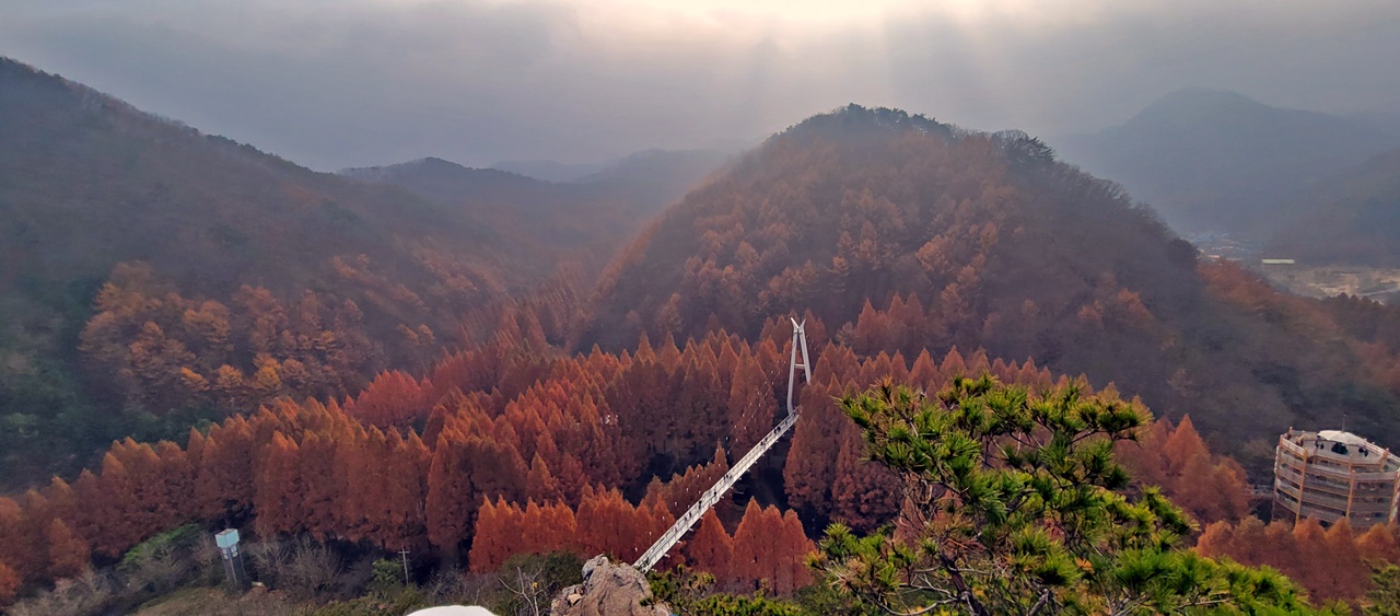 이제 메타세쿼이아가 쭉쭉 서있는 나무 아래 산림욕장으로 갈 차례. 앗, 빛이 들어오기 시작했다. 메타 숲에서 물 한 모금, 심호흡 몇 번 하고 전망대로 향한다. 전망대에서 장안저수지 뷰 살짝 보고 형제봉 방향으로 발길을 옮긴다. 형제봉에선 출렁다리와 숲속어드벤처가 한눈에 들어온다. 아까 갔던 바위 포인트 사람들도 보인다. 갈붉은 메타세쿼이아 숲. 식상한 표현이지만 한 폭 수채화다.