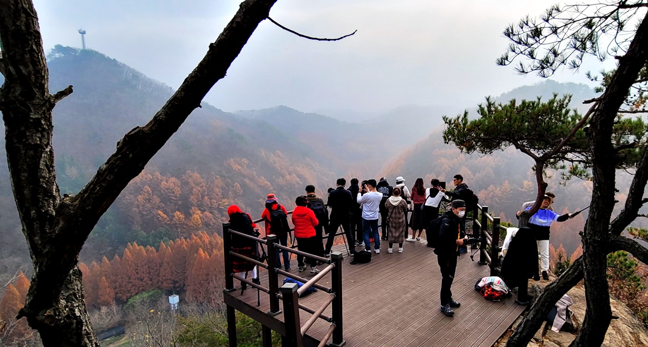 입구부터 만원이었다. 평일(금요일)이고 그리 좋은 날씨가 아니었는데도 주차장은 붐볐고 시내버스에서 내리는 사람도 많았다. 그들의 표정에선 설렘이 그대로 묻어났다. 입구를 지나고 메타세쿼이아 숲이 열리자 사람들의 설렘은 행복감으로 바뀌었다. 이곳저곳 모든 곳이 포토존인 장태산. 길에서, 벤치에서, 나무 밑에서 행복한 표정으로 장태산의 만홍을 즐기고 있었다. 기대감이 점점 커졌다.