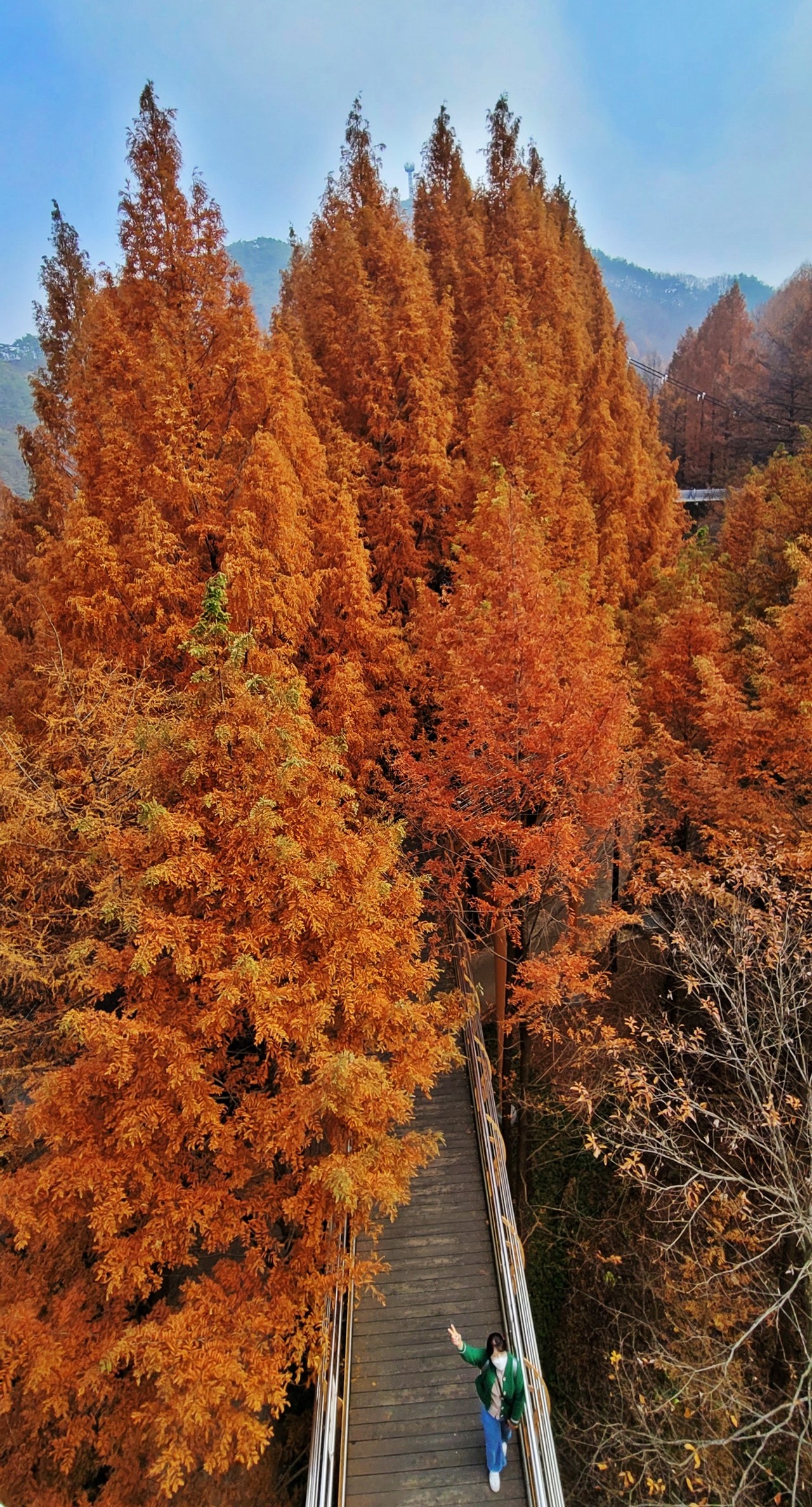 숨 헐떡이며 포인트 도착. 역시나 붐볐다. 사진을 찍기 위해, 찍히기 위한 웨이팅 줄은 꽤 길었다. 흐린 하늘이 야속한지 자꾸 하늘을 올려다보는 사람들. 그래도 행복해 보였다. 표정에서 대화에서 묻어나는 행복감. 혼자 온 낭만객들은 품앗이를 하며 사진을 찍었다. 진한 갈색옷을 입은 숲은 말 그대로 장관이었다. 내려다 본 스카이웨이와 스카이타워 사람들도 행복해보였다. 썸 타는 그대여, 늦가을엔 이곳으로 오시라.