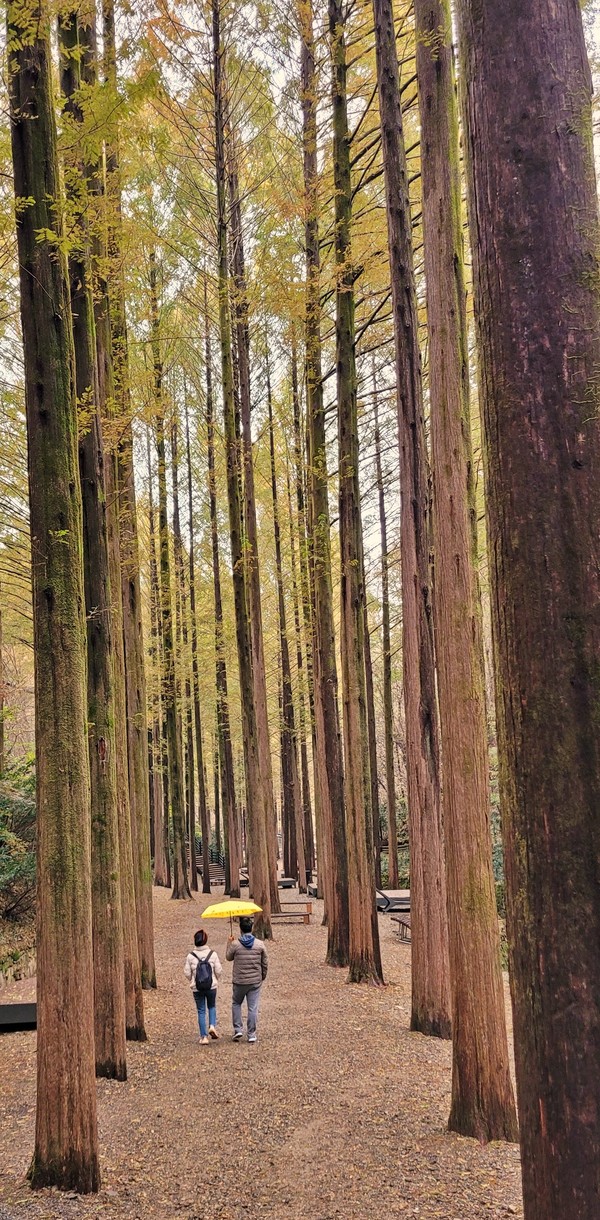 포인트에서 내려와 출렁다리 지나 스카이웨이, 스카이타워 갔다가 메타숲으로 들어오니 이번엔 이슬비가 내린다. 산책하는 이들의 표정에선 여유가 읽힌다. 하나의 우산을 쓴 커플도 보인다. 한 커플은... 만난 지 얼마 안 됐나 보다. (*위 사진 속 커플은 아님) 말투도 몸짓의 뉘앙스도 좀 애매하다. 저 커플 이곳에서 나갈 때는 훨씬 가까워졌으리라. 그렇다. 썸 타는 그대여, 이곳으로 오시라.