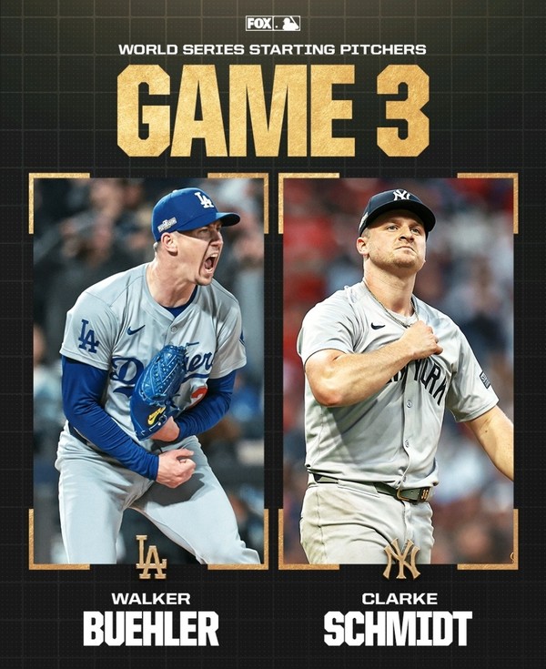 양키 스타디움에서 열리는 월드시리즈 3차전 오는 29일(한국시간) LA다저스는 워커 뷸러를 뉴욕 양키스는 클라크 슈미트가 선발로 나선다.