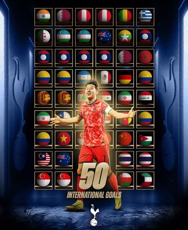 손흥민은 지난 14일(한국 시각) 쿠웨이트와의 '2026 FIFA 북중미 월드컵 아시아 예선 B조 5차전'에서 페널티킥 골을 넣으며 자신의 A매치 50호 골을 달성했다. 이에 토트넘은 공식 SNS에 손흥민의 A매치 50호 골을 축하했다.