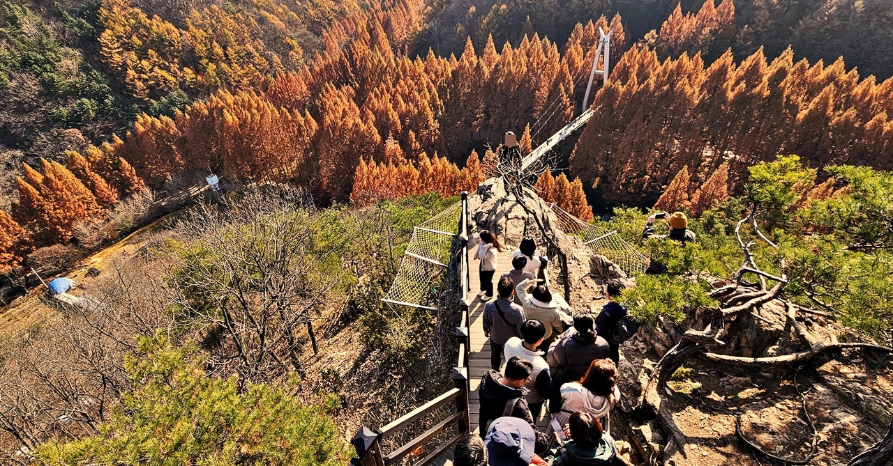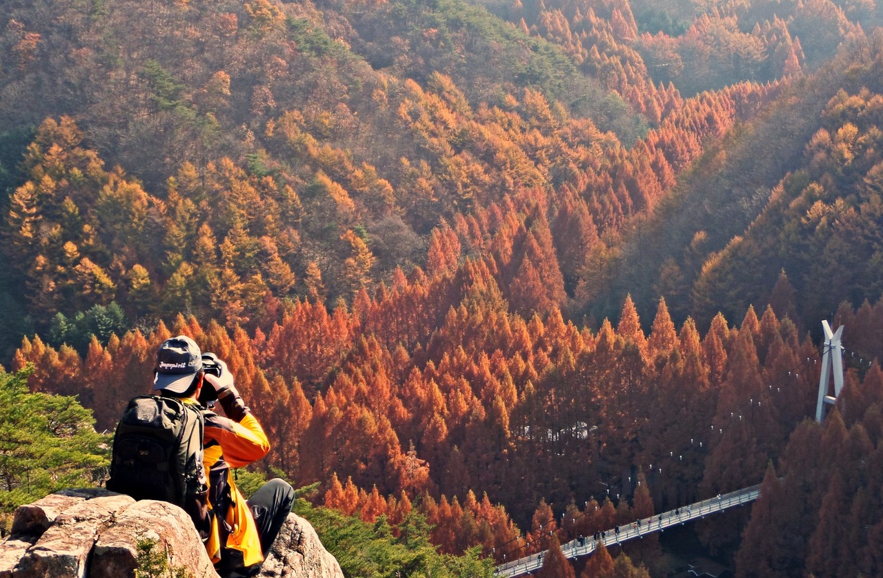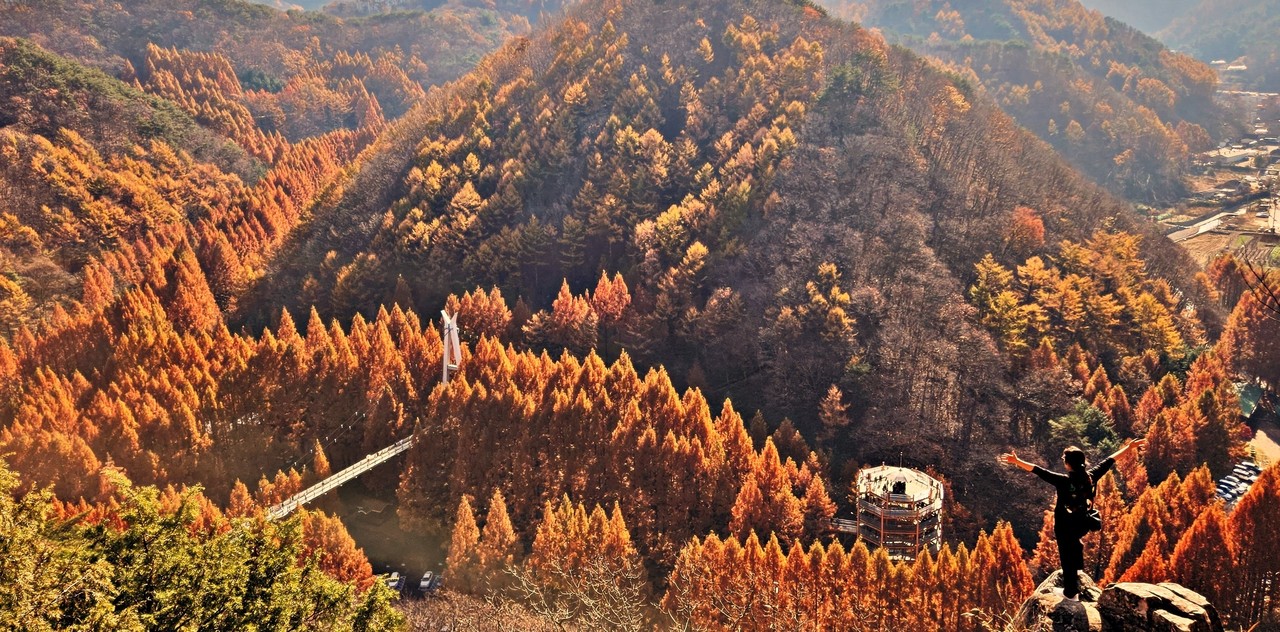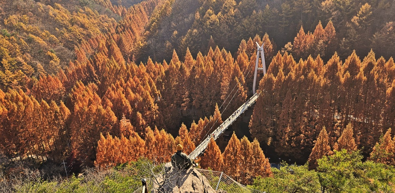 장태산자연휴양림은 사계절 매력적인 곳이지만 늦가을 끝판왕 명성이 가장 높다. 한국관광공사가 추천한 ‘11월에 가볼 만한 여행지 5곳’에 이름 올린 핫스폿 되시겠다. 원체 늦가을 명소로 유명했지만 몇 해 전부터 SNS를 통해 소문난 포토존이 이름을 더 알렸다. 출렁다리 위쪽 장태산둘레길 조망쉼터. 국민스폿이라 불리는 그곳 먼저 오른다.