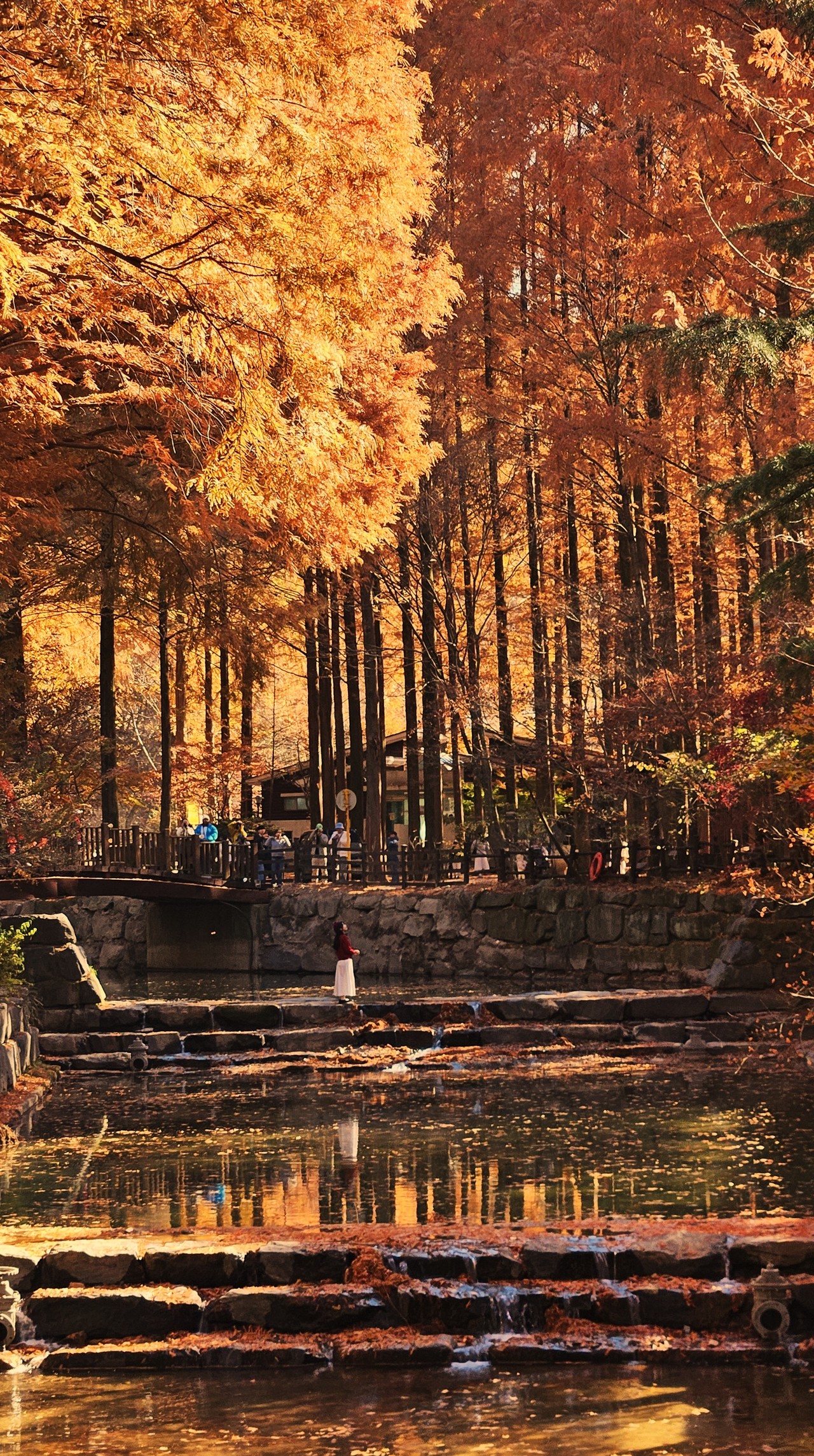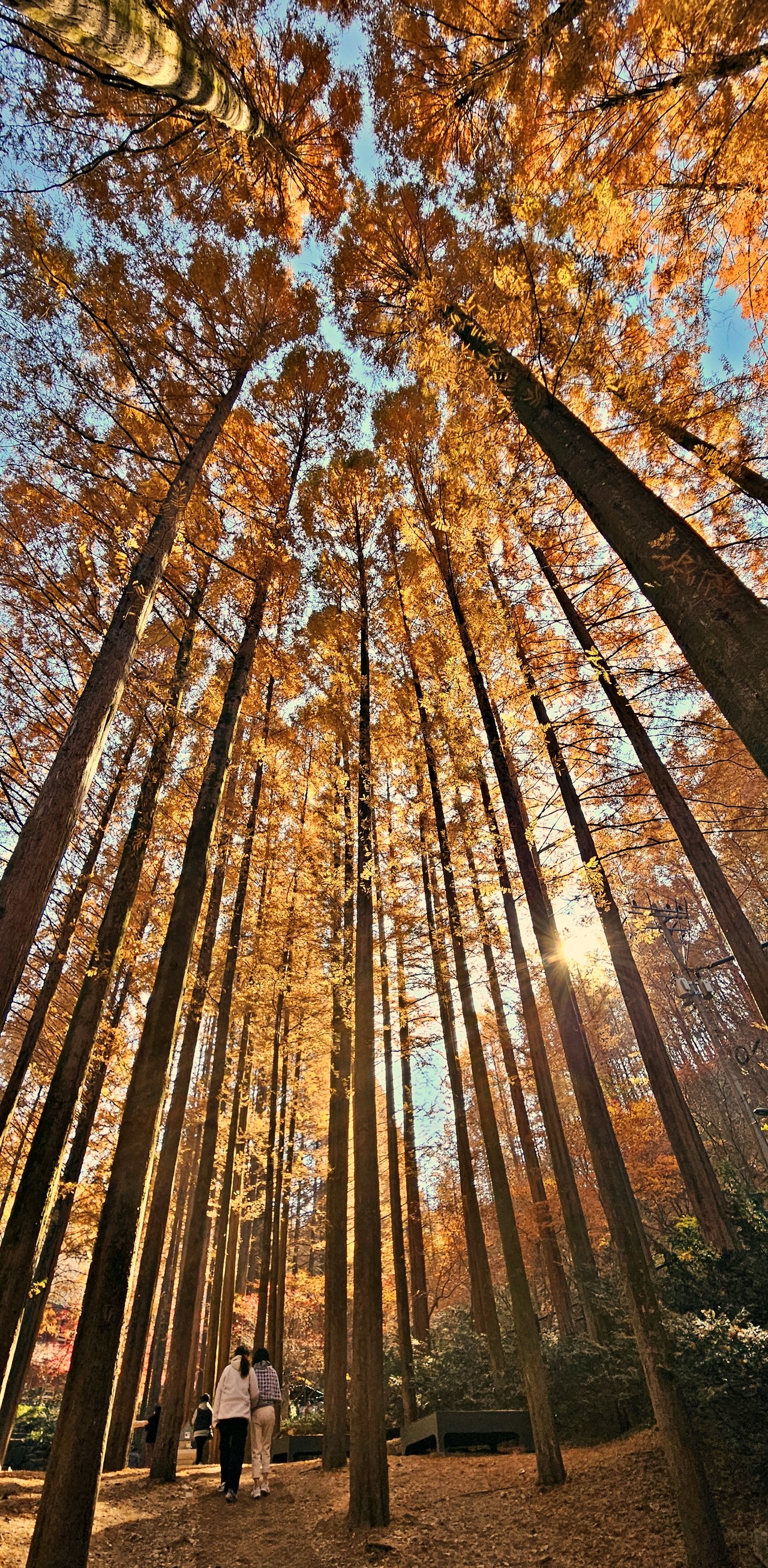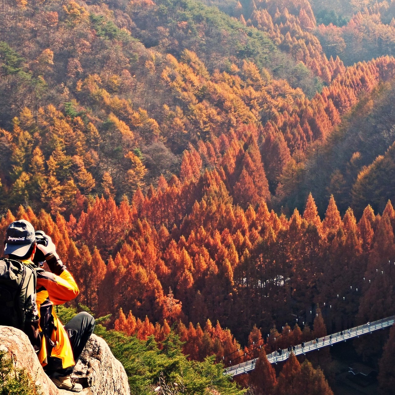 장태산자연휴양림은 사계절 매력적인 곳이지만 늦가을 끝판왕 명성이 가장 높다. 한국관광공사가 추천한 ‘11월에 가볼 만한 여행지 5곳’에 이름 올린 핫스폿 되시겠다. 원체 늦가을 명소로 유명했지만 몇 해 전부터 SNS를 통해 소문난 포토존이 이름을 더 알렸다. 출렁다리 위쪽 장태산둘레길 조망쉼터. 국민스폿이라 불리는 그곳 먼저 오른다.