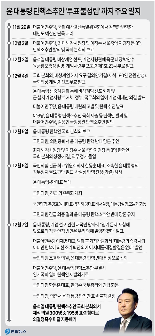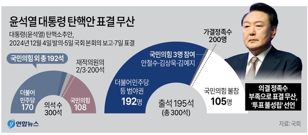 지난 7일 열린 국회 본회의 표결에서 안철수·김예지·김상욱 의원을 제외한 국민의힘 의원들은 모두 투표를 하지 않고 퇴장했다. 이에 따라 윤 대통령의 탄핵소추안 표결을 위한 의결정족수 200명에 미치지 못했다. 우원식 국회의장은 투표 시작 이후 3시간가량 국민의힘 의원들을 기다렸지만 추가 투표자가 나타나지 않아 정족수 미달로 탄핵안 폐기(투표 불성립)를 선언했다.