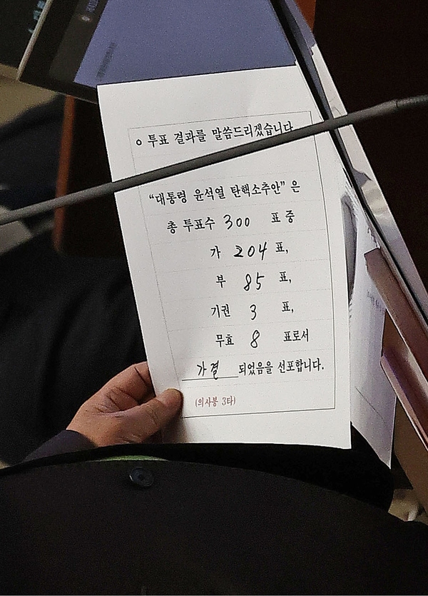 국회는 지난 14일 오후 4시 본회의를 열어 윤석열 대통령 탄핵소추안을 표결했다. 재적의원 300명 중 찬성 204표, 반대 85표, 기권 3표, 무효 8표로 가결됐다. 지난 7일 1차 탄핵안 투표에서는 국민의힘이 집단으로 표결에 불참해 정족수 미달로 투표가 성립하지 않았지만 이번에는 국민의힘이 표결에 참여했다.