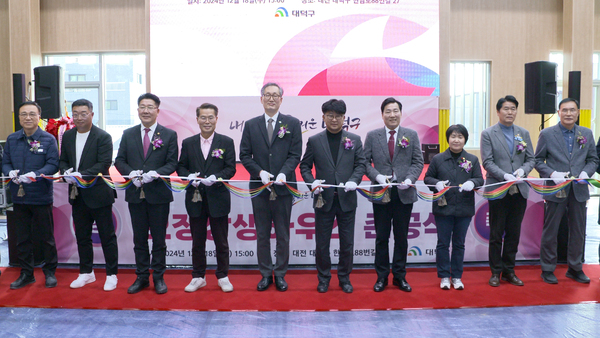 최충규 대전 대덕구청장(오른쪽 다섯 번째) 등이 18일 오정상생하우스 준공식에서 테이프를 자르며 준공을 축하하고 있다. 오정상생하우스는 오정동 443-4번지 일원에 주민복합문화공간인 A동과 창업활성화공간인 B동으로 들어섰다. 구는 도시재생 시설에 대한 사후관리 계획을 수립해 오정상생하우스를 활성화할 방침이다.