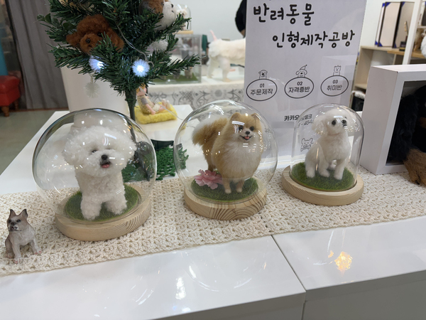 주말 오전 10시경 대전 서구 관저동 한 대형상가. 앞이 안 보일 정도로 휘날리는 눈보라를 뚫고 도착한 이곳은 그야말로 무해함 집합소였다. 진짜 개와 똑같이 생긴 공예품들이 저마다 다른 표정으로 기자를 반기고 있었다. 손바닥만한 크기부터 실물 크기와 똑같은 아트돌, 금방이라도 액자에서 뛰어나올 것 같은 양모펠트 액자 등등. 보기만 해도 뽀송한 모습에 쓰다듬고 싶었던 욕구가 공예품 사이 안내된 ‘눈으로만 귀여워 해주세요’ 문구에 겨우 들어갔다. 원데이클래스에 앞서 강사와 짧은 자기소개를 나누고 본격적인 양모펠트키링 만들기를 시작했다.