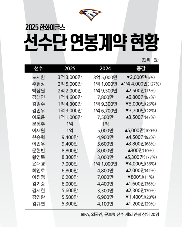 프로야구 한화이글스가 21일 2025년 재계약자 59명 대상 연봉협상을 완료했다.