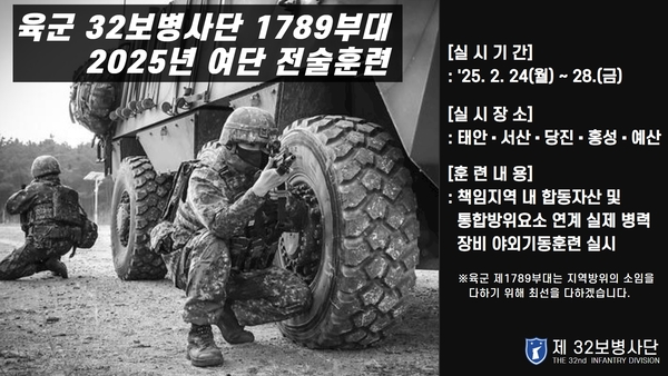육군 제1789부대는 오는 24일부터 28일까지 태안·서산·당진·홍성·예산지역에서 여단 전술훈련을 실시한다.