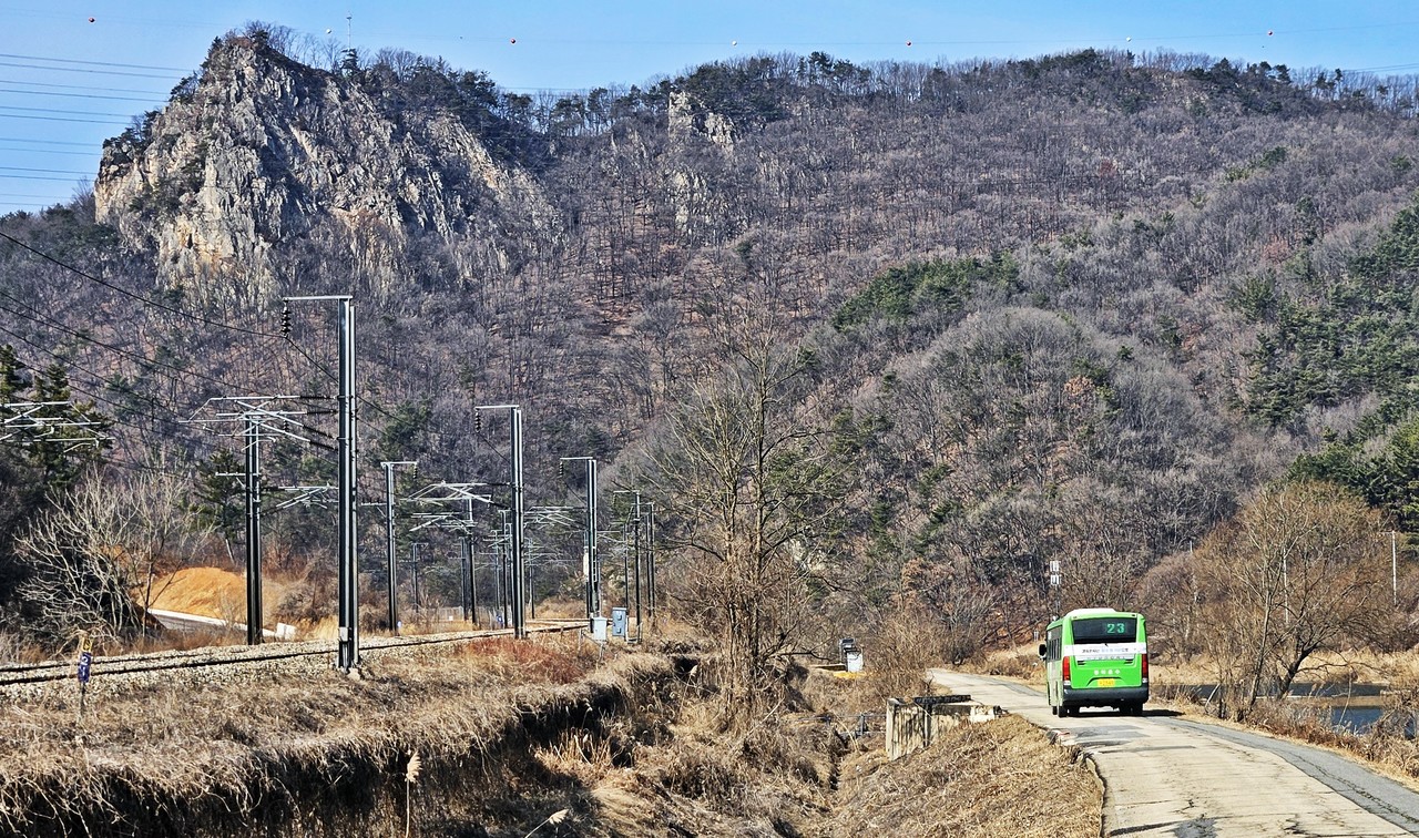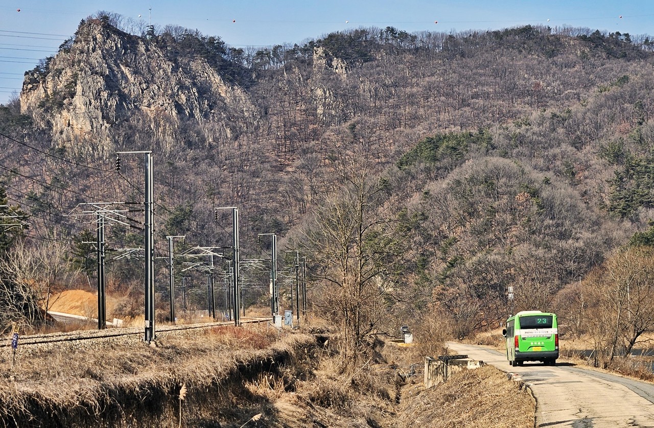 짧은 산행 뒤 두계천을 따라 걷는다. 위왕산을 뒤로하고 걷는데 23번 버스가 들어온다. 위왕산과 초록버스를 함께 사진으로 담는다. 왼쪽 철길에 기차까지 함께였다면 더 좋았을텐데….