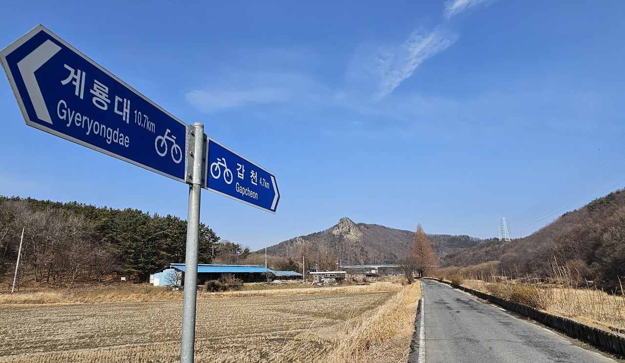 평화로운 무도리들에서 걸음을 시작한다. 왼쪽은 무도리들 오른쪽은 두계천이다. 차도 다니지만 통행이 많지 않아 걷기 좋다. 자전거 애호가들에겐 오래전부터 유명한 힐링코스다. 이곳엔 친절한 이정표가 많다. 10여 분 걷자 나타난 이정표. ←계룡대 10.7㎞, 갑천 4.7㎞→. 이정표 뒤로 포스가 심상찮은 봉우리가 보인다. 위왕산이다. 호남선 기차나 호남고속도로를 타다 보면 계룡과 대전 경계쯤에 보이는 우뚝 솟은 봉우리, 위왕산이다. 그 아래 두계천이 있고 무도리마을이 있다.