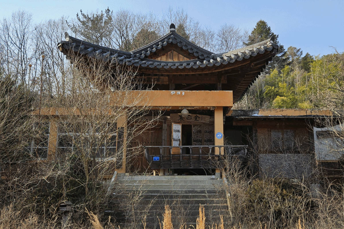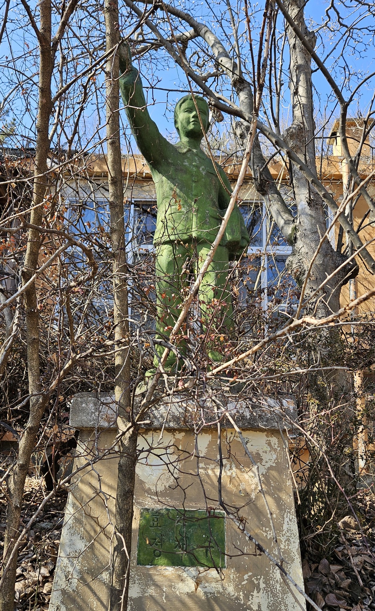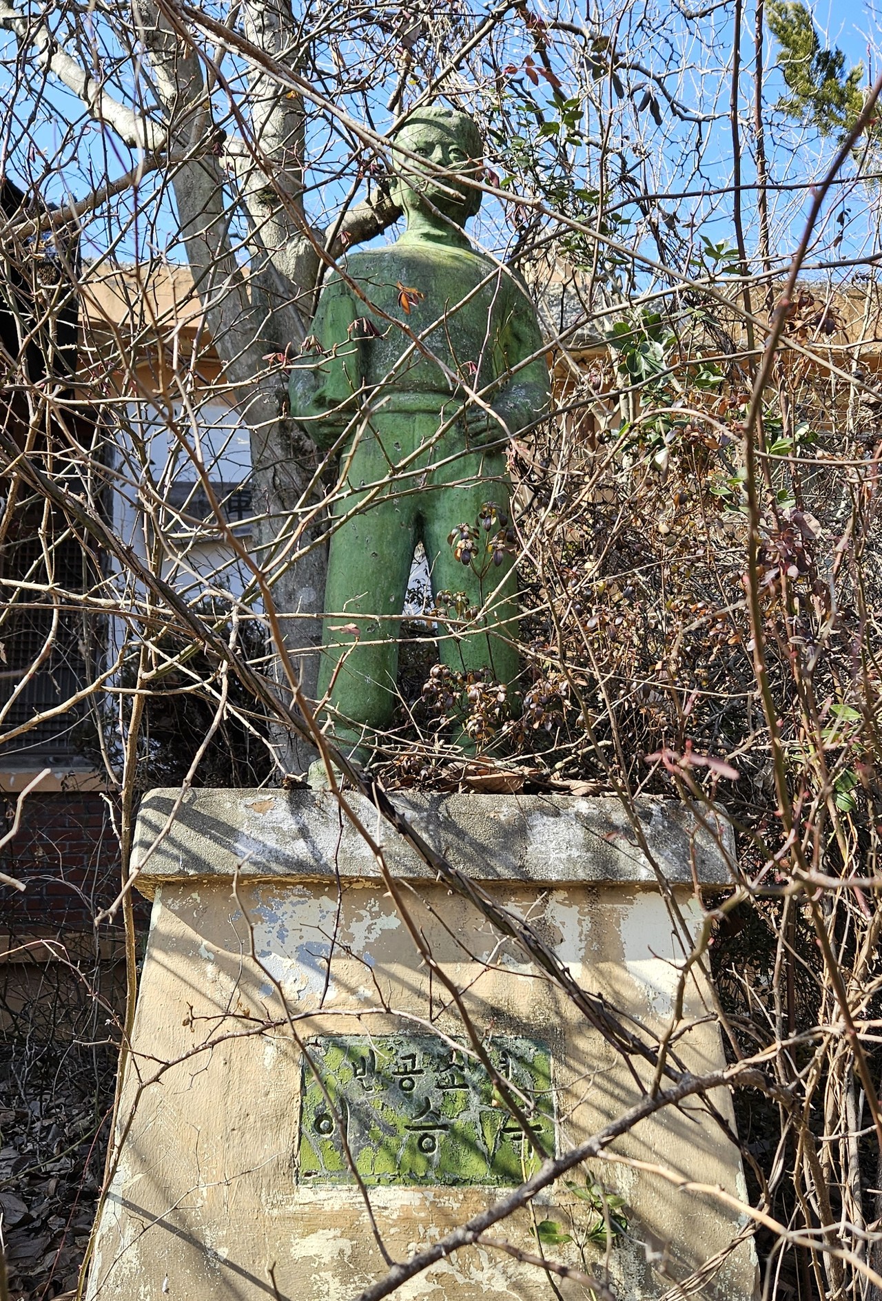 운동장이던 곳은 웃자란 잡초와 잡목이 지배하고 있었다. 그 뒤가 학교건물이었는데, 기와지붕이었다. 그제서야 운동장을 둘러보니 지붕있는 건물이 많았다. 학교 참 특별했군, 생각하던 찰나 낡은 팻말이 나뭇가지 사이로 보인다. 한밭한옥직업전문학교. 나중에 안 사실이지만, 이곳은 원정분교가 1997년 폐교·통합된 뒤 2012년 폐교 부지에 한밭한옥직업전문학교가 설립돼 운영됐었다. 기와지붕이 학교 건물에 얹혀져 있고 운동장에 지붕 건물이 많았던 이유, 그제서야 비밀이 풀렸다. 이곳도 방치하기보다 원정역과 연계해 문화공간으로 활용해도 좋겠다는 생각이 들었다. 아, 이곳에서 ‘반공소년 이승복’ 동상과 ‘효자 정재수’ 동상을 오랜만에 봤다. 기분이 더 묘했다.