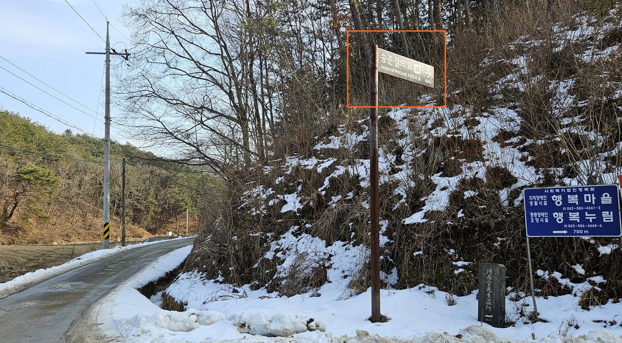 시골길 따라 다시 걷는다. 길옆에 맑은 냇물이 흐른다. 후곡천이다. 참 예쁘다, 감탄사가 나오는 작은 냇물이다. 자박자박 걷다보니 ‘송준길의 묘 400m→’ 이정표가 나온다. 다 왔구나, 가벼워진 발걸음을 옮긴다. 10여 분 걷는데 뭔가 싸-한 기운이 느껴졌다. 지도 앱을 열어 위치를 확인한다. 이럴수가, 반대편 길을 걸었던 거다. 분명 이정표가 가리키는 방향으로 왔는데…. 다시 갈림길. 오른쪽으로 가라는 이정표 아래 ‘동춘당선생묘소 ←’ 방향표지석이 비로소 보였다. 아 이런. 반대방향을 가리키는 잘못된 이정표. 대전시 담당부서는 하루빨리 바로 잡아주시길. (대전시 문화유산과에서 연락이 바로 왔습니다. 이정표 바로 잡았다고. 나사가 빠진 상태에서 바람이 불어 이정표가 돌아갔다고 하네요. 문화유산돌봄사업단이 빠르게 조치 완료했다고 사진과 함께 알려왔습니다. 빠른 조치 감사드립니다)