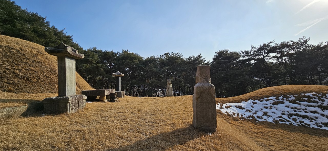 갈림길에서 4분 뒤 커다란 느티나무 보호수를 만난다. 수령 250년이 넘은 또다른 보호수. 그 옆에 ‘동춘당선생묘소 ←’ 표지석이 또 있다. 다 왔구나. 동춘당 묘 가는 길은 야트막한 오르막이었다. 수려한 소나무들이 입구를 만들어 길손을 맞이했다. 규모가 어마어마한 동춘당 선생의 묘. 한 시대를 풍미했던 그였기에 왕릉처럼 컸다.