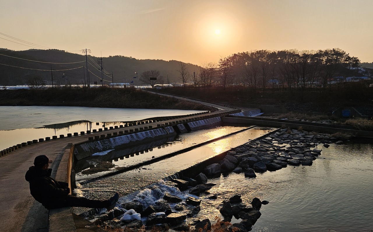 시나브로 날이 저물고 있다. 오늘 걷기도 얼마 남지 않았다. 클래식 촬영지 근처 보 앞에서 꽤 오랜 시간 서성인다. 석양을 배경으로 영상과 사진을 찍는다. 무심히 흐르는 물 앞에서 물멍에 빠져들었다. 그때였다. 노을빛 비치는 물가 수로 앞에서 불규칙한 움직임이 감지됐다. 뭐지, 역광이어서 잘 보이진 않았지만… 수.달.이.다.