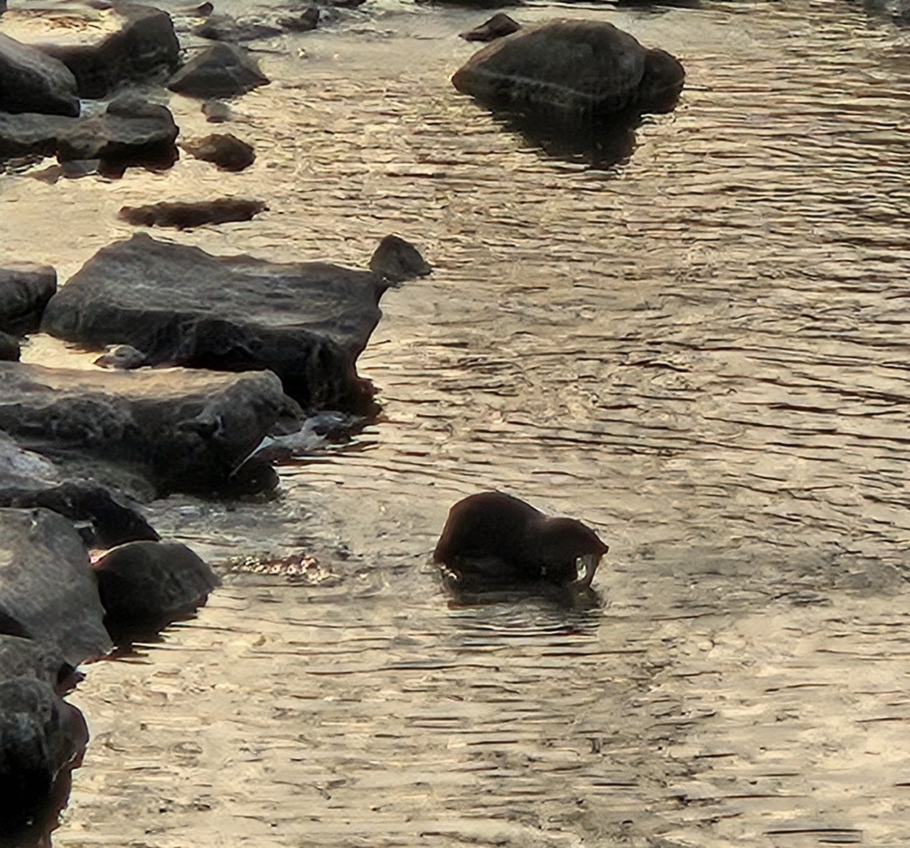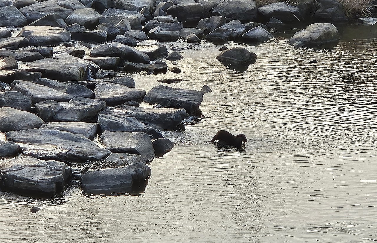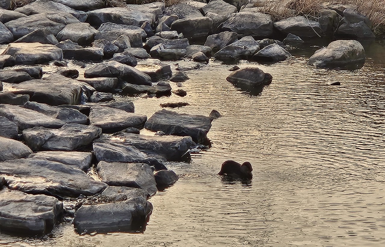 서둘러 휴대폰 카메라 줌을 당긴다. 조금만 더 오래 있어라, 오래 있어라. 조금만 더... 흥분된 감정 감추지 못하고 찍어댄다. 눈 깜짝할 사이 수달은 물 속으로 유유히 사라졌다. 찍은 사진을 확인한다. 아쉽다. 거리가 꽤 되고 역광이긴 했지만 아쉽다. 좀 더 침착했더라면... 제법 큰 물고기를 입에 물고 클래식 촬영지 방향으로 사라진 수달. 그리고 몇분 뒤, 그 큰 물고기를 벌써 해치운 걸까. 수로를 통해 다리 반대편으로 건너가는 수달. 나도 황급히 추격에 나서본다. 앗, 저기 있다. 얼굴만 내밀고 배영으로 멀어져 가는 녀석. 나를 바라보며 미소 짓는 듯한 표정. 나 잡아봐라~. 아, 짧은 만남 아쉬운 이별. 반가웠다 친구야.