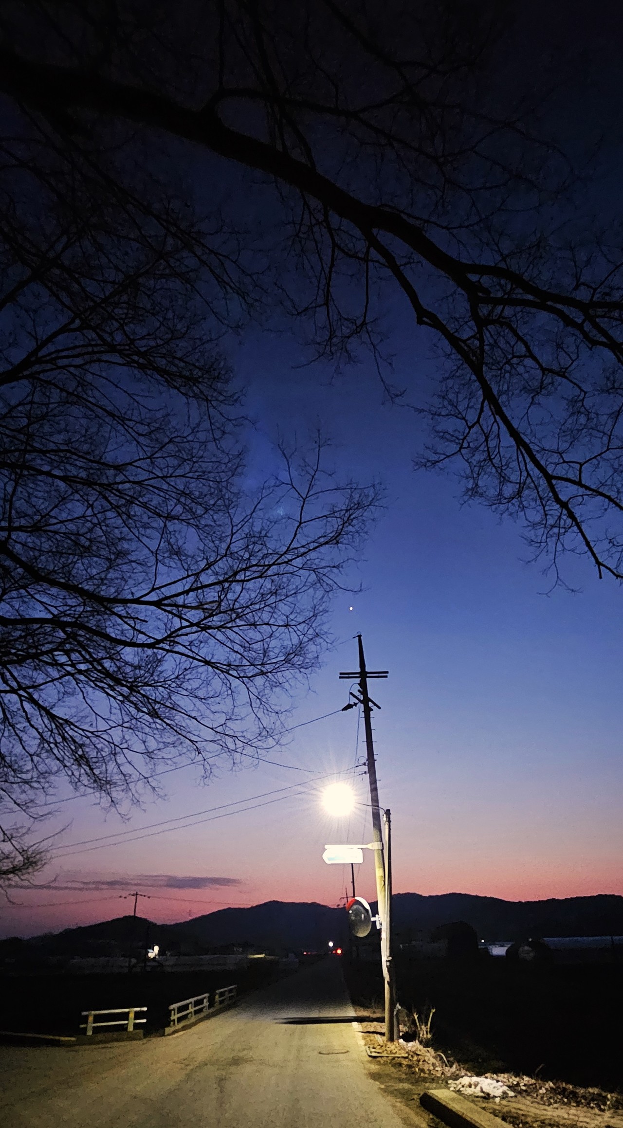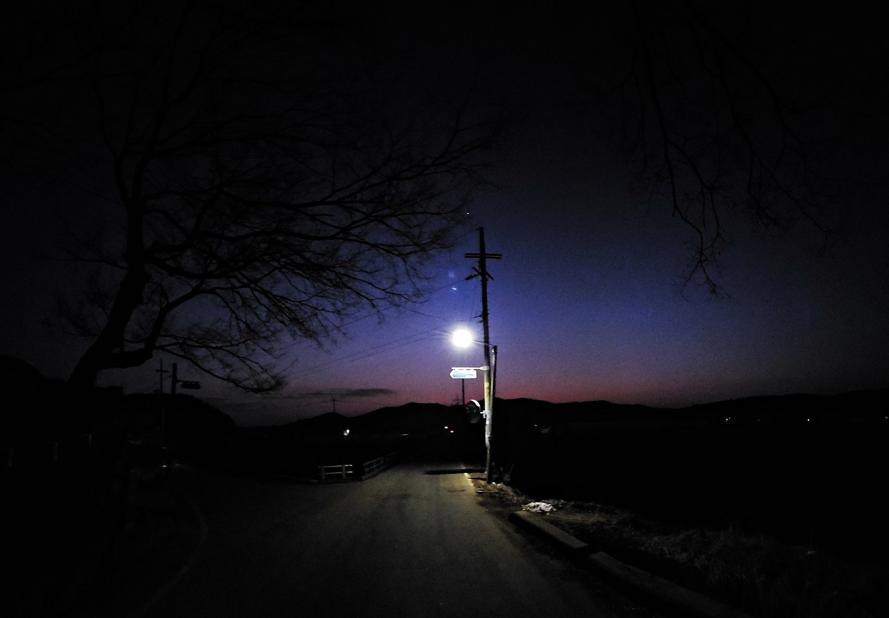 갑천 위를 지나는 정뱅이다리를 지날 때쯤 어둠이 짙게 바뀌었다. 5분 남짓 걸어 도착한 용촌1통 정류장. 커다란 용촌동 보호수 느티나무 옆에서 23번 버스를 기다린다. 조용한 농촌마을은 어둠 속으로 스며들고 있었다. 노래를 흥얼거린다. 김현식의 '어둠 그 별빛'.