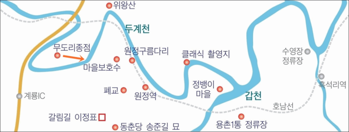 그렇다. 그곳에서 수달을 만났다. 눈빛도 교환했다. 여름엔 반딧불이도 만날 수 있는 청정지역이다. 영화 클래식에서 그들이 반딧불이를 만난 곳이다. (물론 영화 속 반딧불이는 CG겠지.) 그래서일까, 그 길을 걸으면 그곳만의 BGM 플레이리스트가 있다. 너에게 난 나에게 넌, 사랑하면 할수록/반딧불이/강가에서, 델리스파이스 고백, 김광석 너무 아픈 사랑은 사랑이 아니었음을…. 그리고 이규석의 기차와 소나무. 호남선 기차가 바로 옆으로 지나가지만 기차가 서지 않는 간이역이 있다. 대전 서구 원정동은 클래식 촬영지가 유명해지면서 마을도 함께 힐링여행지로 입소문이 났다. 원정동에 가면 원정역이 있고 두계천도 있고 클래식 촬영지도 있고 위왕산도 있고 폐교도 있고 동춘당 송준길 묘도 있고 수달도 있다. 23번 버스 타고 무도리종점(원정동)으로 간다.