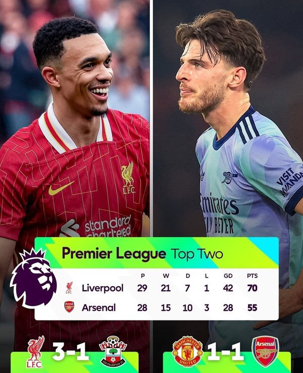 맨유는 9승 7무 12패(승점 34)로 14위에 머물렀고, 아스날은 15승 10무 3패(승점 55)로 리버풀에 한 경기 덜한체 승점 15점 뒤쳐졌다. 특히 아스날은 3경기 연속 승점 드랍을 하며, 사실상 리그 우승은 어려운 듯하다.