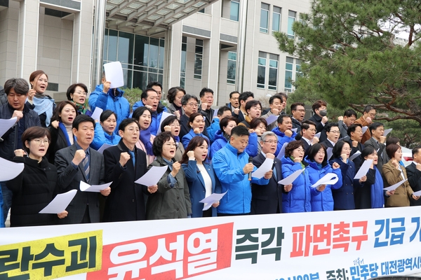 더불어민주당 대전시당이 윤석열 대통령 구속 취소를 유도한 검찰을 비난했다. 사회적 혼란이 커진 만큼 윤 대통령의 즉각 파면만이 민주주의 수호란 주장을 펼쳤다. 국민의힘 시당은 곧바로 헌재를 압박하는 것이라고 되받아쳤다.